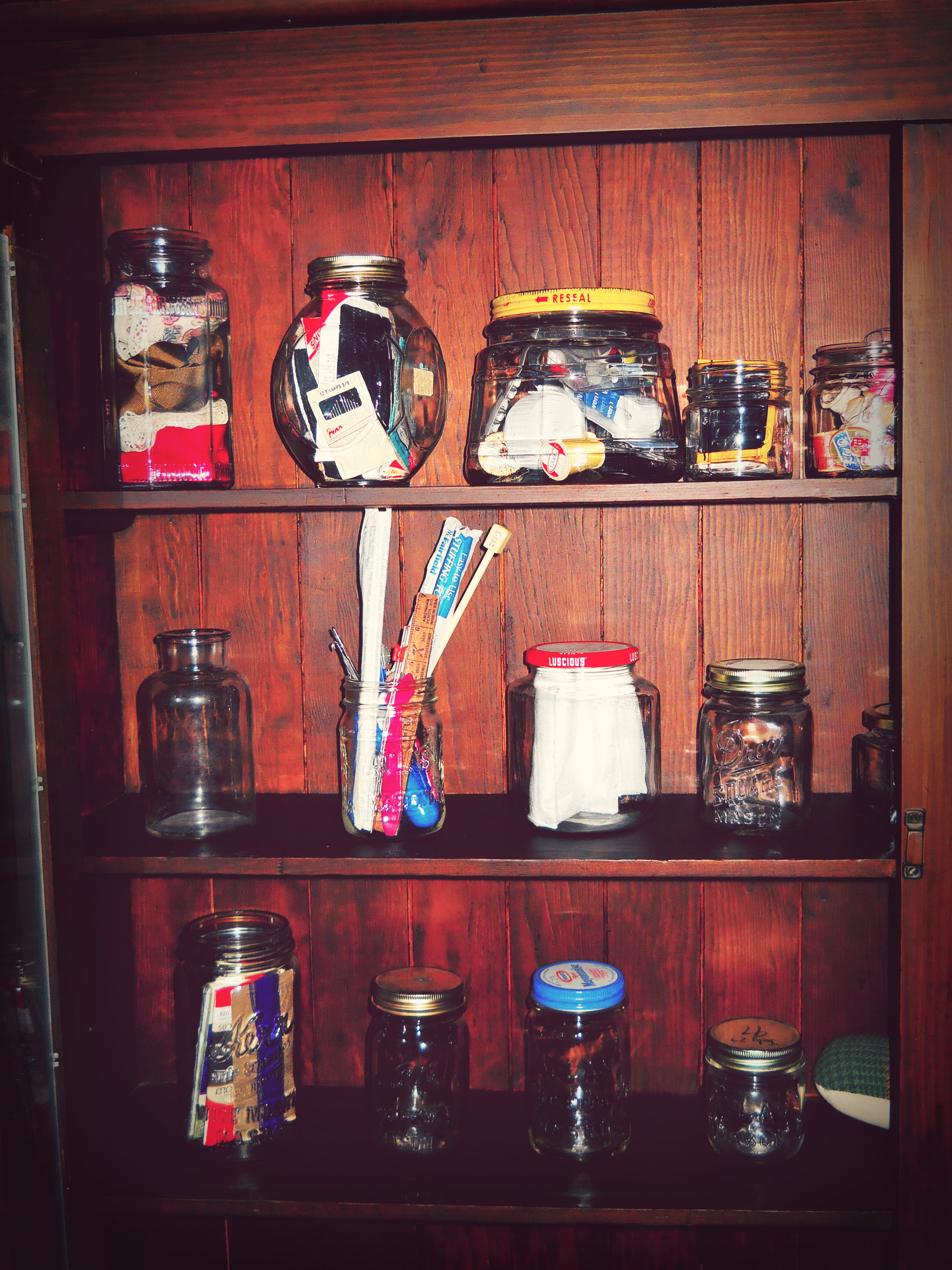 DSCN0172.1My project this afternoon was to get my sewing cabinet set up. The cabin has three rooms–A living room, a bedroom, and a lean-to. The lean-to is where I am hoping my sewing things will get to live. Although it is a little hard to see in the picture, there is a glass-front cabinet against the wall to the left. DSCN0079.1About two weeks ago, Mom, Sarah and I boxed up all the old jars (you’d be amazed how many there were!), and separated the keepers from the pitchers–Or, rather, the ones useful for canning from the ones we probably wouldn’t want to use for canning. Of the ones we wouldn’t use, I confiscated some and now can use them for sewing organization!  With all the extra jars cleared out or put to use, and with the interior dusted and wiped down with oil soap, it works nicely as storage space for sewing notions.