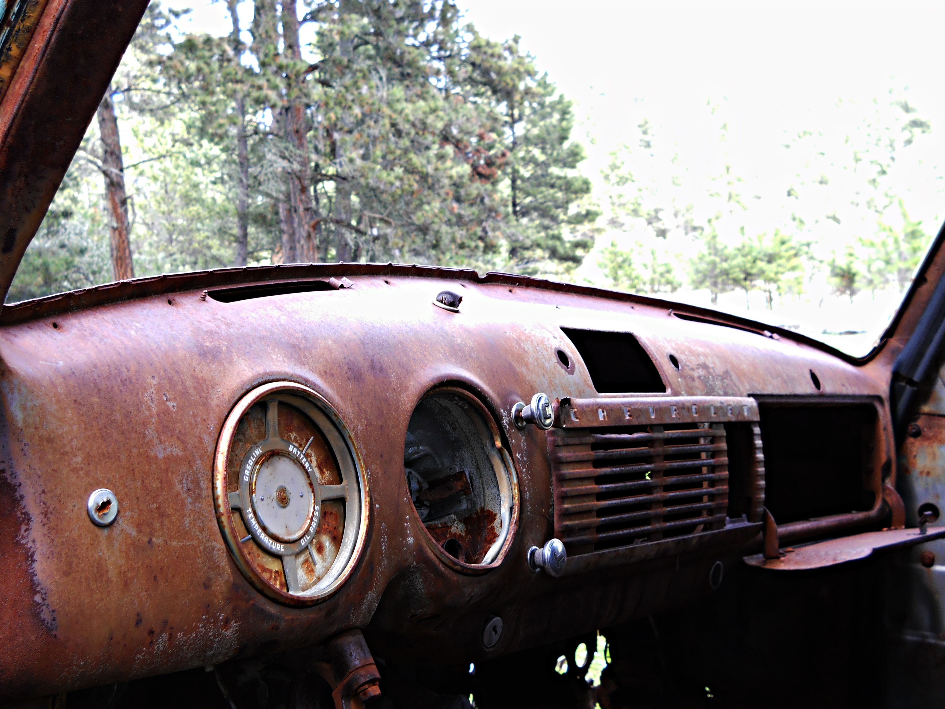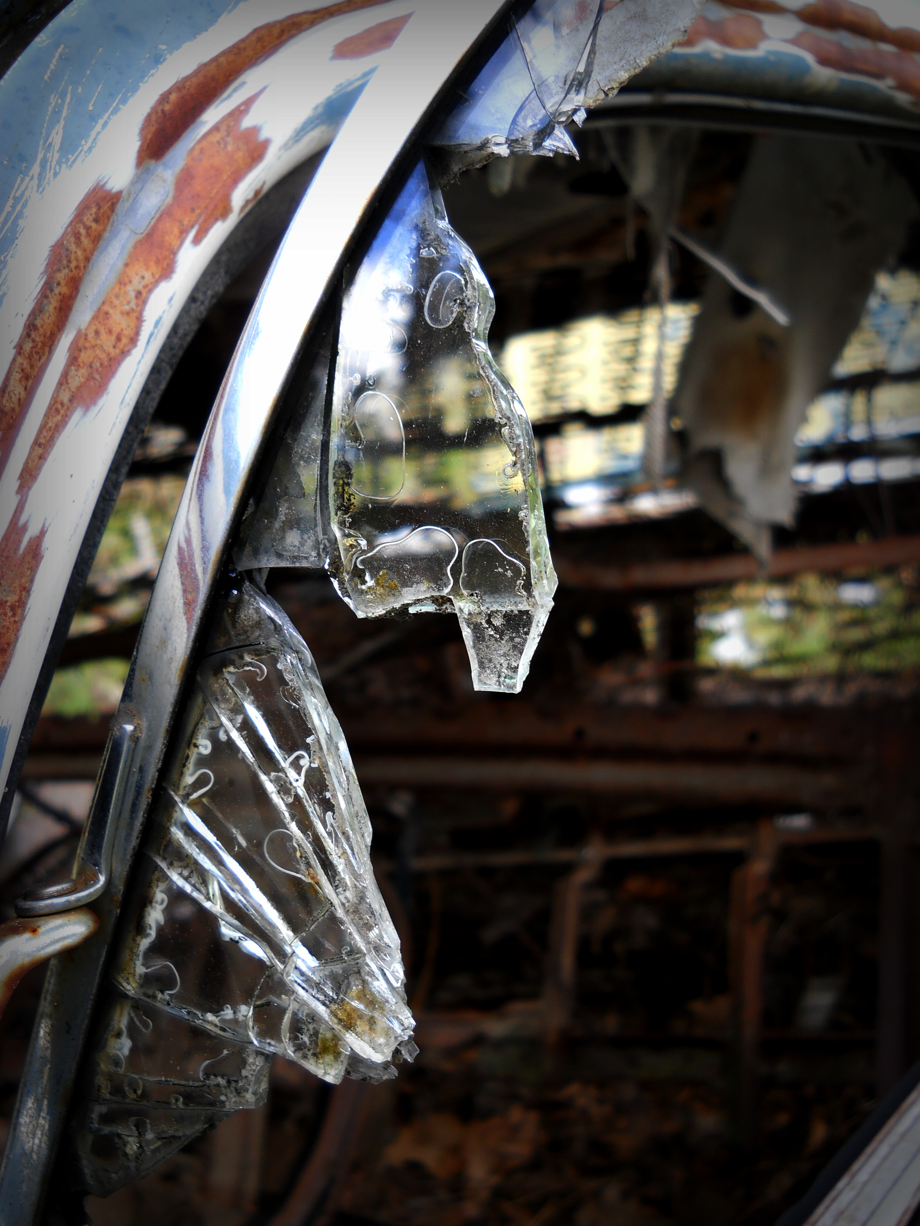 The little ghost town sprawls in an open meadow, and remnants of later days, forgotten later days, are scattered farther into the overgrowth of trees. An old crumbling stove. Ancient automobiles with rust-eaten bodies, rotted cushions, shattered glass, and polished chrome.