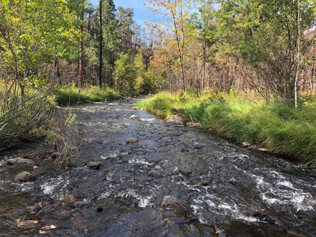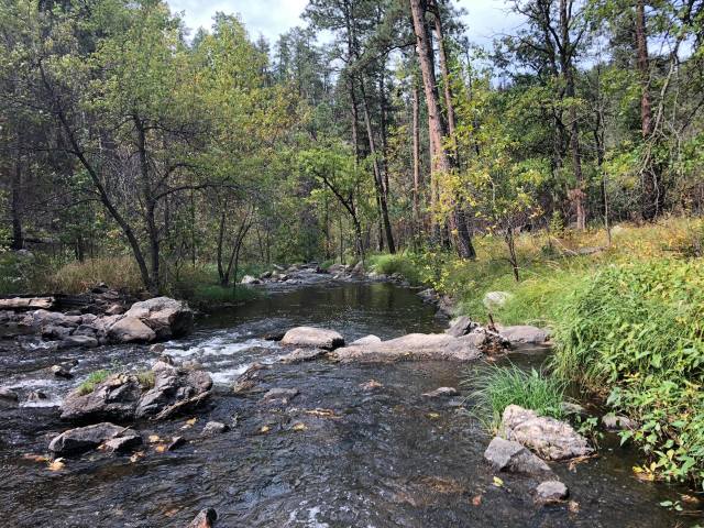 We got a little bit of a late start on this glorious first day of fall, since I’d kind of forgotten how long it took to get all the way around the Wildlife Loop. We met up at about 9:30, parked my truck, drove Axel’s car to French Creek Horsecamp, which is the western trailhead for the French Creek Natural Area. We started on the trail at 10:15. The first creek crossing wasn’t more than a half mile in, and the realization hit us fast that “creek crossings” really meant “creek crossings.” Like, with lots of water. And no good way across. We managed to scramble over without getting wet. Barely.