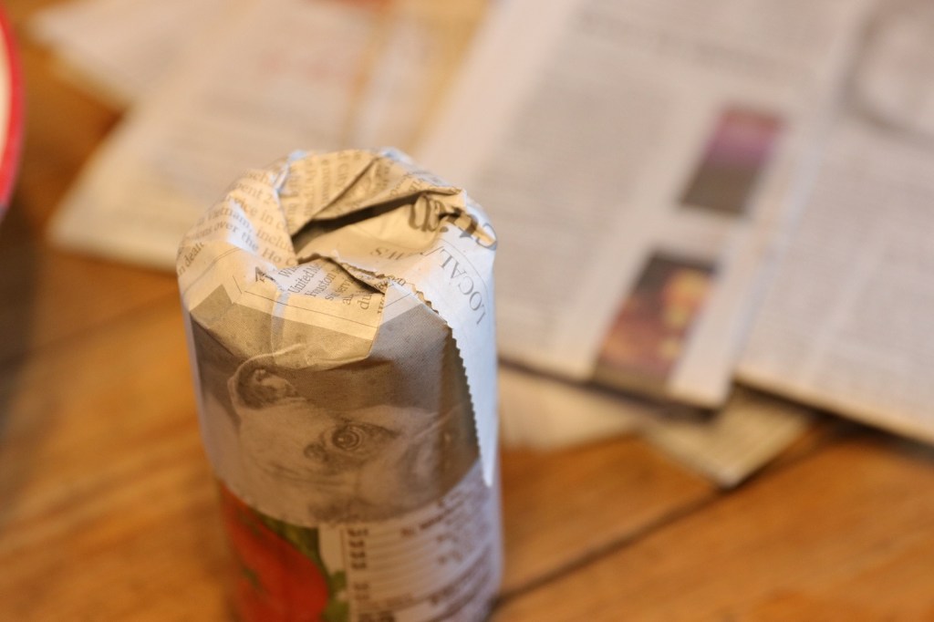 These sturdy, biodegradable little pots are formed from strips of newspaper, each approximately 1/3 of a newspaper cut lengthwise (fold the paper in thirds lengthwise and cut along those folds) and are rolled around a cylindrical item, such as a spice container or a pop can, depending on how big you want your paper pots. I played around with a couple of different sizes for these pots, what I liked the best was a pop can (well, V8 to be precise, since I don’t drink pop) for size.