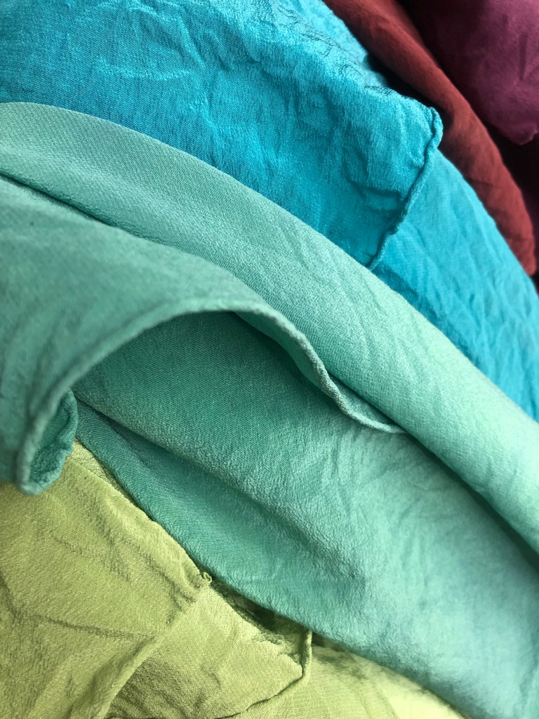 The last few days, I’ve puttered away at dyeing some silk scarves and I’m tickled pink with how they turned out. It is fun to see how the colors actually rendered , after the fabric was heated, rinsed, and dried!