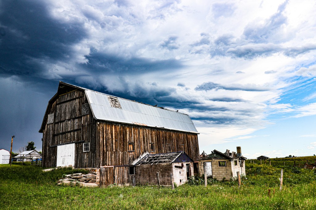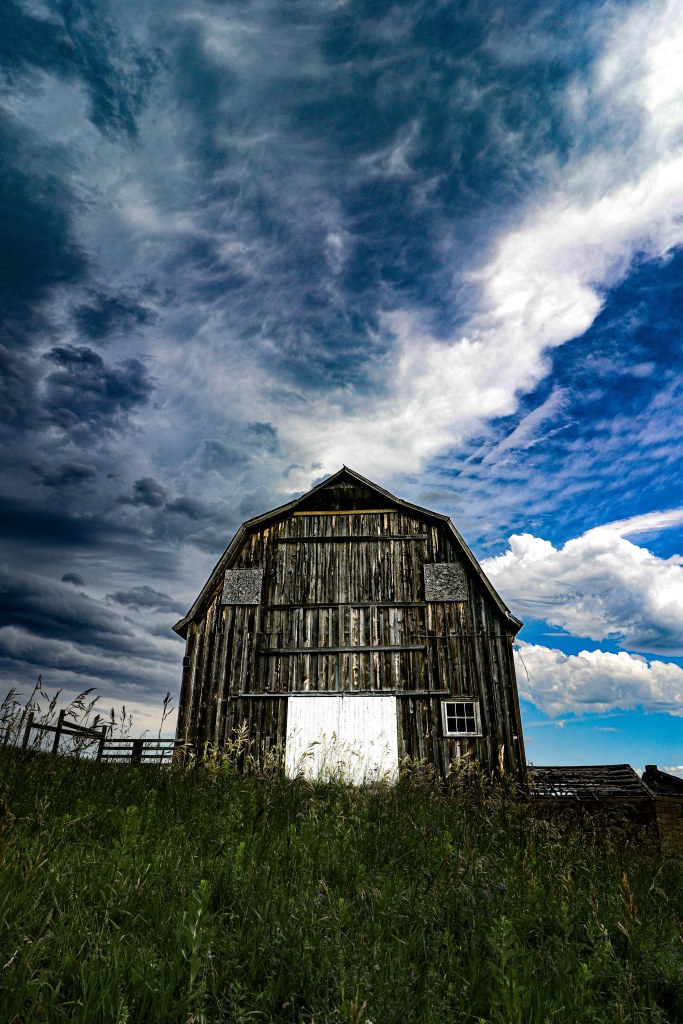 So much power is in the sky. The clouds were awesome and wild over this old barn, its aged and greying wood, boarded up windows, tumbling cinderblocks, crumbling foundation, and chipping paint speaking to the myriad of storms this piece of history has weathered. Yet still it stands.