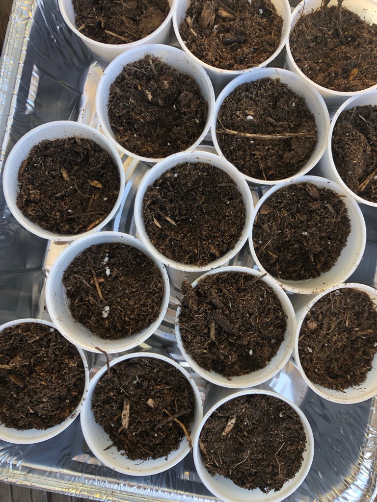 This year, I opted to use dixie cups and solo cups instead of paper pots for seed starting and, boy, it has made things easier. I may roll some paper pots as I get more herbs going, things that will grow quickly and be transplanted quickly, but I’ve been happy with the switch. They hold up much better to jostling and watering, are much easily to fill with dirt, and they’ll provide a deeper base for root development, especially on things like tomatoes. A drill works great to make drain holes in the bottom, easily putting holes in 100 cups in, oh, three minutes. It really speeds up the planting. I’ll be able to save them this year and reuse for next, so that’ll be a nice time-saver.