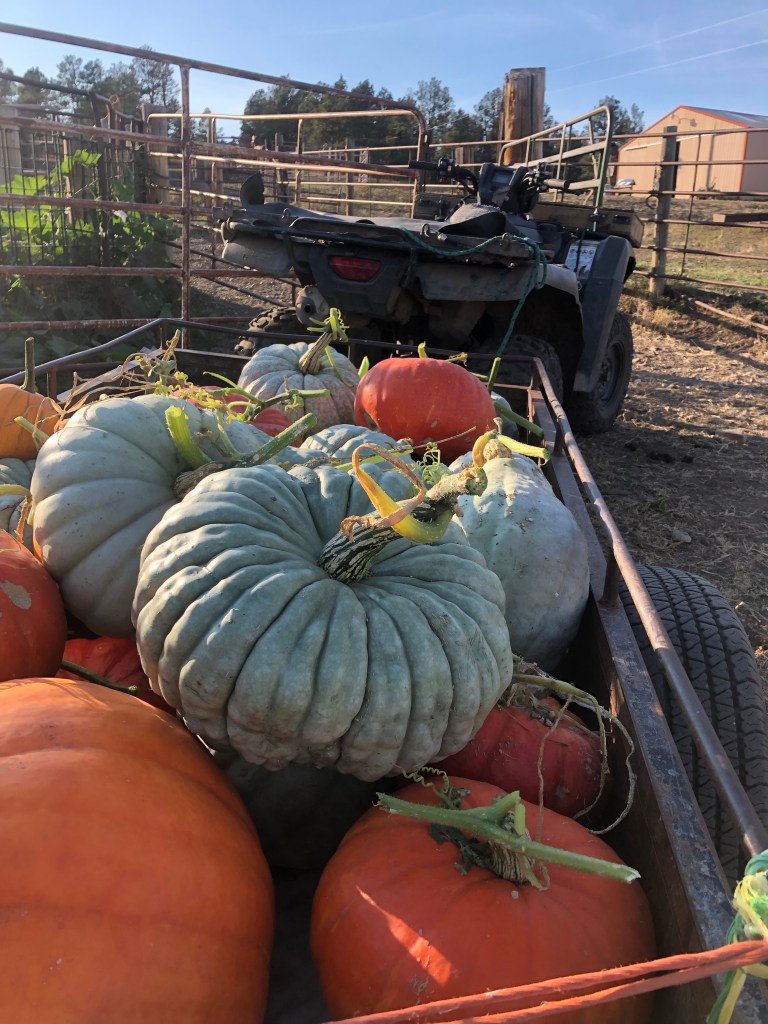 Scrawled on the paper were four Latin names, and names of heirloom pumpkin varieties in columns underneath for careful seed selection and planting logistics in order to facilitate selective pollination. Beneath that was a list of the garden areas I employ, namely the yard garden up by the house, which comprises the greenhouse/hoophouse, two large raised beds made of old stock tanks, and the environs; and then the nursery garden, a pen in the corral that doesn’t get used in the summer but is freshly fertilized and naturally tilled each spring, which was the pumpkin and sweetcorn patch this year. And in spite of an epic summer-long battle against invading grasshoppers, squash bugs, and even my over-zealous chickens, after dodging summer hail and contending with the usual drought conditions, during all of which I nearly threw up my hands and walked away, after spending a lovely fall afternoon harvesting pumpkin after beautiful pumpkin, the trials of the growing season were thoroughly forgotten. As I set pumpkins out to cure on the south end of the house, delighting my eyes in the variety of the harvest, my optimism cup was filled back up and I was ready to take it up a few notches by going full-scale commercial pumpkin farmer with my own specially-cultivated varieties of pumpkins. Because if 50 pumpkins is good, 500 pumpkins would be amazing.