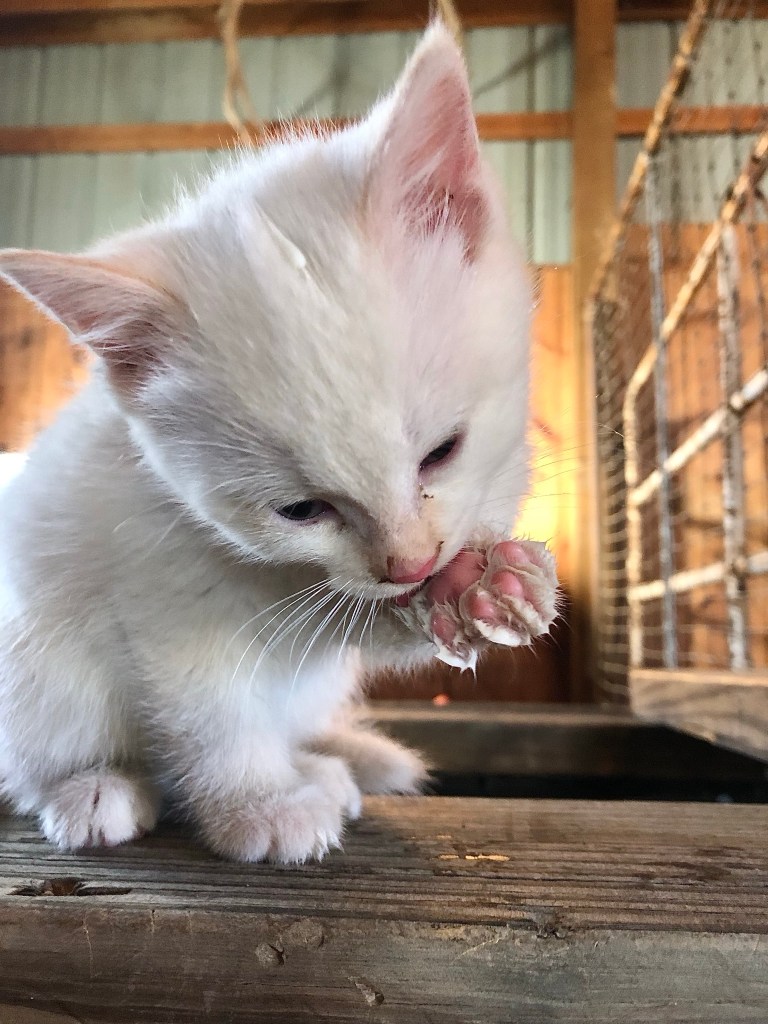 Kittens in the barn, shades of cinnamon and the one little white one.
