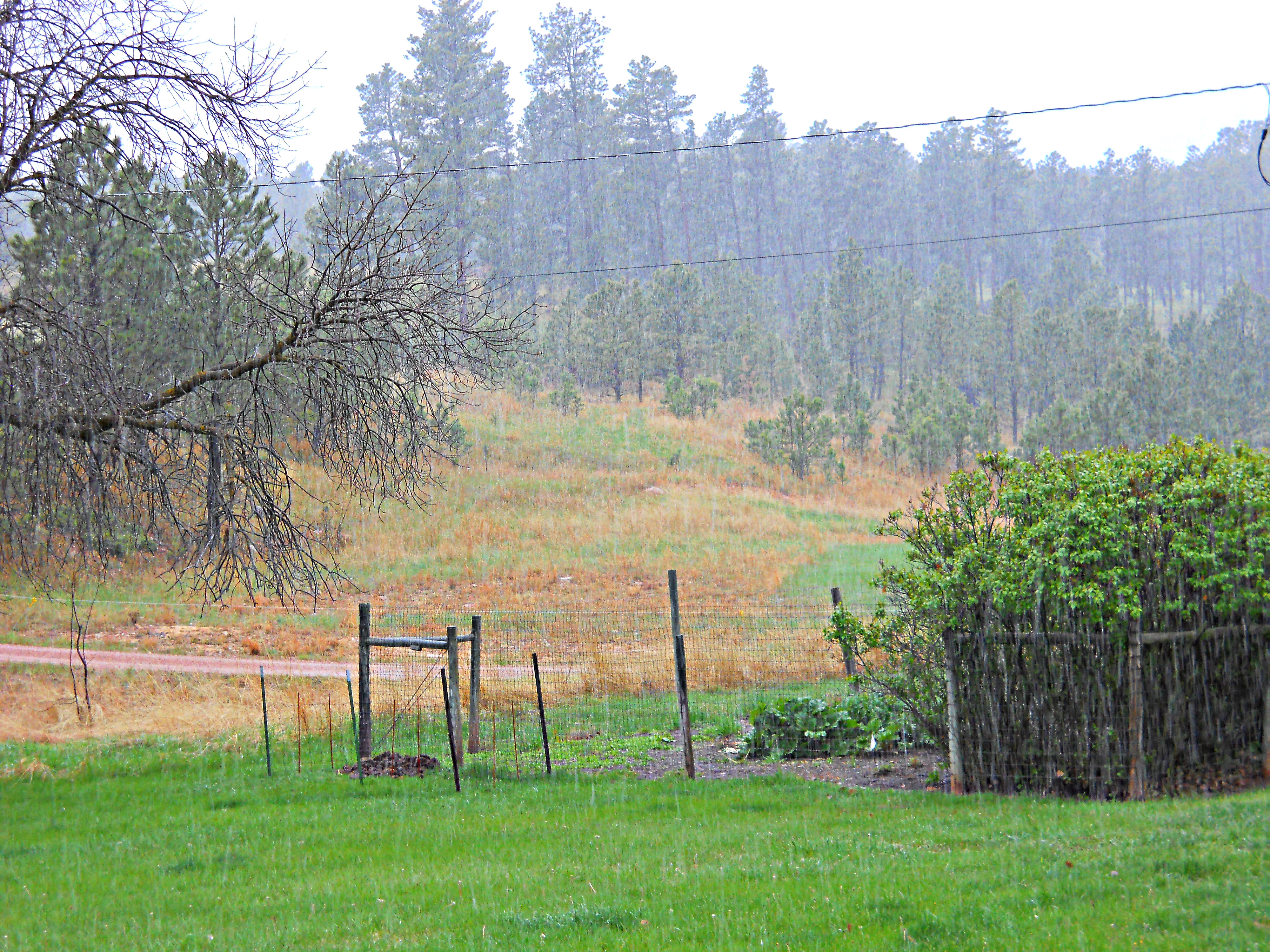 But talk of snow predicted for this weekend left everyone here a little incredulous. The “one good snow” habitually expected in April never came, and May is well arrived! Yet snow we are getting, and with a vengeance. It has already gone from the sleety, wet stuff in the photo to more of a real snow, with white clinging to the grass and rocks and fences. Probably for a born-and-bred South Dakotan, this is more a nuisance than anything. For ranchers, this is downright offensive, potentially interfering with the well-being of spring calves and shipping. But for a native Oklahoman and long-time resident of Illinois, this is something of a novelty. Snow in May? That’s a never before heard of idea where I came from! For now, I’m enjoying it from the window, but when I have to drive to work today in a few hours, confronting a 14% grade, mountain highways, and twists and turns, I might not enjoy it quite so much. And when the leaf-laden tree branches are shattered, spring flowers are blighted, and the snow melts into a swampy mess, I might very well resent it. And if it causes cattle losses and traffic hazards, I’ll hate it as much as the rest of them.