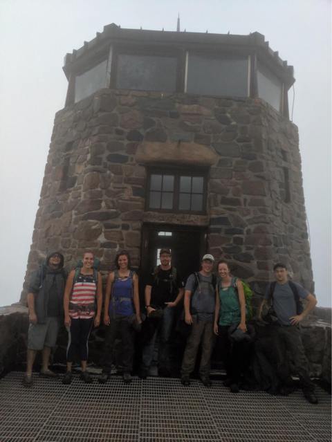 It rained on and off, so our rain jackets went on, then came off, and went on again, and when we were about a mile and a half or two miles from the top, the thunder started. It was faint and unthreatening, and although the recommended caution is to not hike if you can even hear thunder, I’m afraid no one around here would ever hike if we seriously listened to that advice, since it always thunders. Not saying people shouldn’t listen to that advice, obviously, but I’m simply reporting on reality…Anyway, we continued on to the top, and by the time we were out in the open approaching the peak, the lightening was happening pretty fast, and the storm was obviously getting closer, just about on top of us. There was some concern among a few of us, but the firetower was just ahead, just another five or ten minutes away, so we kept on. If we turned around, there was less chance of shelter, lots of snags and widow makers, lots of open ground, no place to hide. The fog was even thicker now, and the sun had set awhile ago.