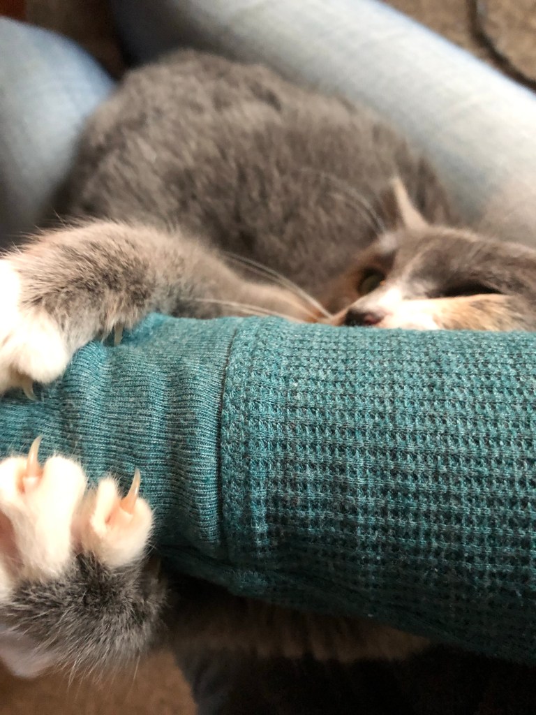 My usual entourage of cats had no interest in chicken chores this morning, and stayed snug in their cat house, looking pretty miffed. Except for Polly. She darted inside and since she’s getting a little daily doctoring (and will keep me company while I work on some projects inside…) I didn’t feel like stripping down to go catch her. And she really is good company, even if rather obnoxious.