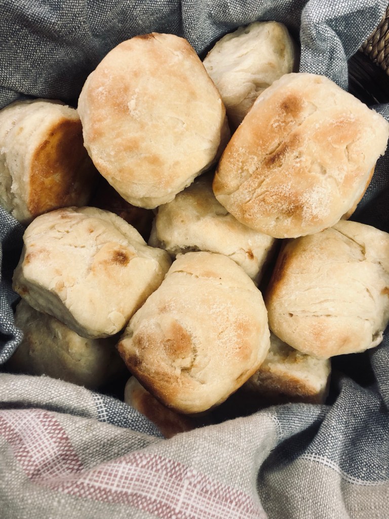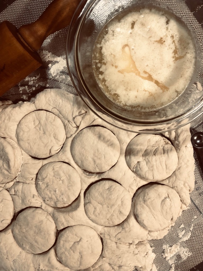 I find that a single batch fills a 9×9 baking pan, with a couple biscuits leftover, which I tend to cook in a separate smaller dish. Depending on how thick they are cut, obviously, you could stretch the yield on this recipe. There is a considerable amount of oven spring with this biscuits–they will puff up in the oven! They are served best fresh out of the oven, and I love to serve these with homemade butter and homemade jam! They’re always a hit.